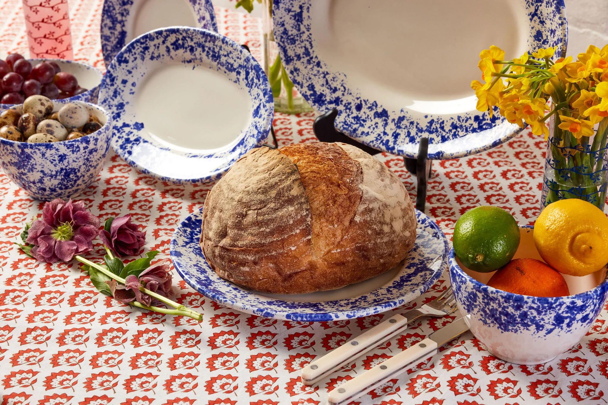 Introducing our new line of ceramic spongeware, The Gable Collection. Handmade in Vietri sul Mare, Italy and inspired by the classic American stoneware designs of the 20th century, The Gable Collection is durable enough for everyday use and handsome enough to adorn the walls of a French country house. A staple of country design, the simple sponge printing technique was popularized in the late 19th century, and production was concentrated in places like Zanesville, Ohio and Trenton, New Jersey. The full collection includes dinner and side plates, a salad bowl and serving platter, and a jug and mugs.